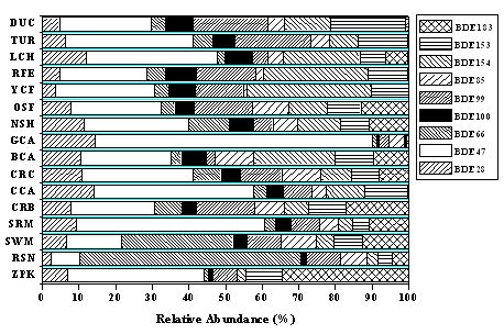 Compositional profiles of PBDEs in aquatic organism collected from Baiyangdian Lake, North China (ZPK = zooplankton, RSN = river snail, SWM = swan mussel, SRM = shrimp, CRB = crab, CCA = common carp, CRC = crucian carp, BCA = bighead carp, GCA = grass carp, NSH = northern snakehead, OSF = oriental sheatfish, YCF = yellow catfish, RFE = ricefield eel, LCH = loach, TUR = turtle, and DUC = duck)