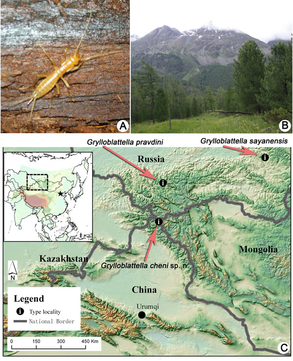 (A) Female. (B) Habitat. (C) Type localities of all known three species of Grylloblattella.