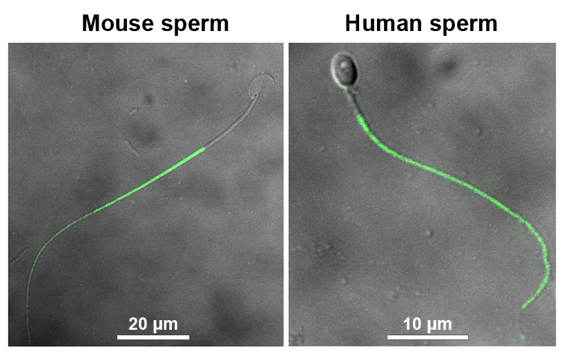 In collaboration with Prof. Tonghui Ma and Prof. Qi-xian Shi, the research team lead by Prof. Enkui Duan lab has revealed that aquaporin3 (AQP3) is a water channel localized in sperm tail membrane of mice and humans. Aqp3-deficient sperm show normal motility activation in response to hypotonicity but display increased vulnerability to hypotonic cell swelling, characterized by increased tail bending after entering uterus. The sperm defect is a result of impaired sperm volume regulation and progressive cell swelling in response to physiological hypotonic stress during male-female reproductive tract transition. Time-lapse imaging revealed that the cell volume expansion begins at cytoplasmic droplet, forcing the tail to angulate and form a hairpin-like structure due to mechanical membrane stretch. The tail deformation hampered sperm migration into oviduct, resulting in impaired fertilization and reduced male fertility.