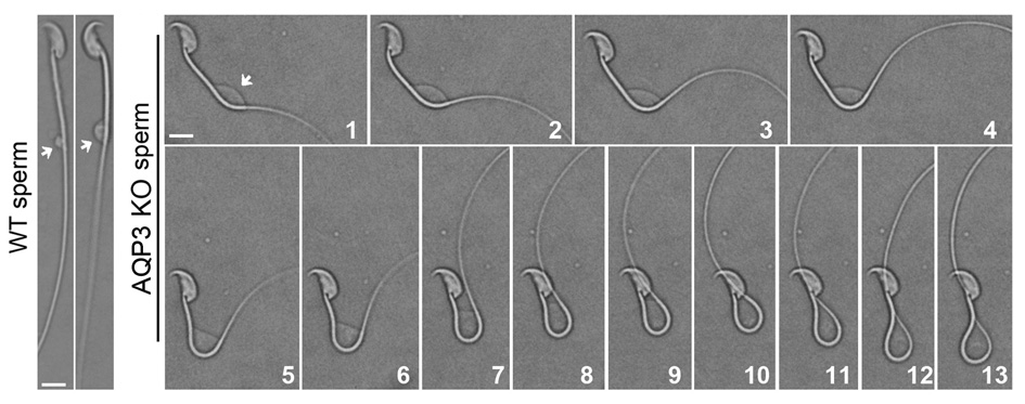 Figure.2 Time-lapse imaging reveals sperm tail bending (Aqp3 null sperm) process forced by progressive membrane expansion upon physiological hypotonic stress. The cell swelling begins at cytoplasmic droplet (indicated by arrows). Note the wildtype sperm only shows mild swelling.