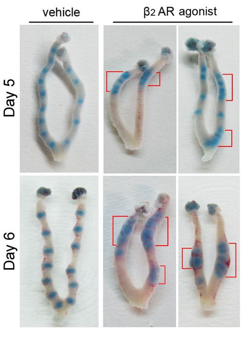 Figure.1 Blue dye reaction shows implantation sites in Day5 and Day6 pregnancy mice. The evenly spaced pattern of implantation sites was severely disrupted by transient β2-adrenoceptor activation at Day4, resulting in embryo crowding.