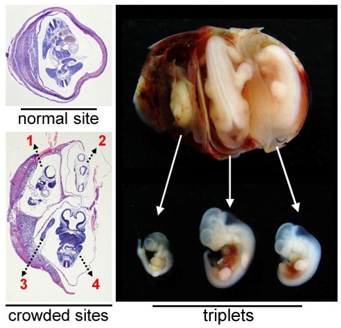 An example of triplets of (Day12) resulted from disrupted embryo spacing (right). The three embryos were crowed in one placenta. The embryo in the middle showed normal degree of development, the ones in the left and right showed different degrees of retarded embryo growth, the left one was tend to undergo resorption.