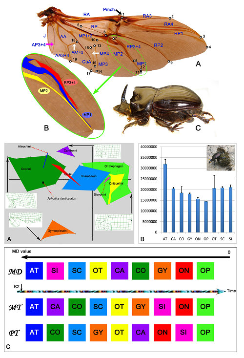 This study examines the morphological variation of hindwings based on 19 landmarks, 119 morphological characters, and 81 beetle species. There was a strong correlation between the morphometric tree and all phylogenetic trees (r>0.5). Reconstructions of the ancestral wing forms suggest that Scarabaeinae hindwing morphology has not changed substantially over time, but the morphological changes that do occur are focused at the base of the wing. These results suggest that flight has been important since the origin of Scarabaeinae, and that variation in hindwing morphology has been limited by functional constraints. Comparison of metric disparity values and relative evolutionary sequences among Scarabaeinae tribes suggest that the primitive dung beetles had relatively diverse hindwing morphologies, while advanced dung beetles have relatively similar wing morphologies. By integrating morphometric and cladistic approaches, this paper sheds new light on the evolution of dung beetle hind wings.