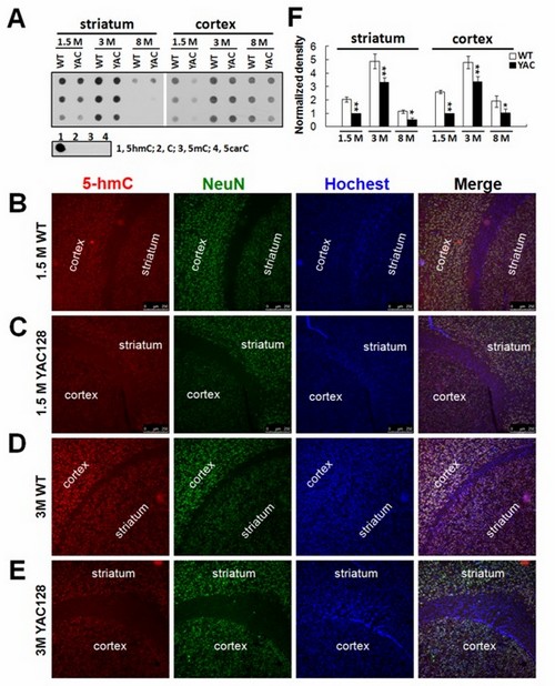 Molecular and Cellular Neuroscience group led by Dr. Tie-Shan Tang, Institute of Zoology, Chinese Academy of Sciences, has observeda marked reduction of 5-hmCsignalin YAC128 (yeast artificial chromosome transgene with 128 CAG repeats) HD mouse brain tissues when compared with age-matched wild type (WT) mice, suggesting a deficiency of 5-hmC reconstruction in HD brains during postnatal development. Genome-wide distribution analysis of 5-hmC further confirmed the diminishment of 5-hmC signal in striatum and cortex in YAC128 HD mice. General genomic features of 5-hmC are highly conserved, not being affected by either disease or brain regions. Intriguingly, they have identi?ed disease-specific (YAC128 versus WT) differentially hydroxymethylated regions (DhMRs), and found that acquisition of DhmRs in gene body is a positive epigenetic regulator for gene expression. Ingenuity pathway analysis of genotype-specific DhMR-annotated genes revealed that alternation of a number of canonical pathways involving neuronal development/differentiation (Wnt/b-catenin/Sox pathway, axonal guidance signaling pathway) and neuronal function/survival (glutamate receptor/calcium/CREB, GABA receptor signaling, dopamine-DARPP32 feedback pathway etc) could be important for the onset of HD.These results indicate that loss of the 5-hmC marker is a novel epigenetic feature in Huntington’s disease, and that this aberrant epigenetic regulation may impair the neurogenesis, neuronal function and survival in HD brain. This study also opens a new avenue for HD treatment; re-establishing the native 5-hmC landscape may have the potential to slow/halt the progression of HD.