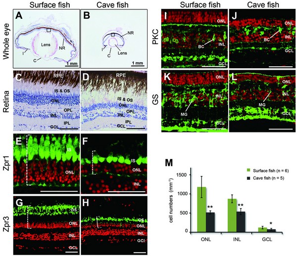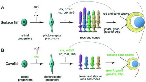 Cave animals evolve distinct troglomorphic characters in perpetual darkness, most commonly, the reduction of eyesight, pigmentation, pineal organ, and scales, countered by augmented chemoreceptors, mechanoreceptors, and lipid storage. The most extensive investigation of the evolution of troglodyte traits in cavefish comes from investigations of the Mexican tetra Astyanax mexicanus. In cave Astyanax, lens apoptosis associated with over-expression of sonic hedgehog (shh) induces eye degeneration. Although troglodyte features evolved independently many times in cavefish, we do not yet know whether independent evolution of these characters involves common genetic mechanisms. The freshwater teleost genus Sinocyclocheilus (Cypriniformes: Cyprinidae) is endemic to the karst region of the east Yungui Plateau and northwest Guangxi in southwestern China. The genus includes many surface-dwelling species and at least 10 cave dwelling species with different degrees of eye degeneration. The research on a variety of cave-animal models is necessary to understand whether independent evolutionary lineages utilize related molecular genetic mechanisms, or if evolution can achieve similar results by different mechanisms.