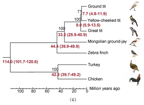 The ground tit (Parus humilis) is endemic to the Tibetan plateau. It was thought to be close to the ground jays because of their morphological similarities until recently more evidences suggest their “tit” taxonomic status. Ornithological Research group led by Prof. Lei Fumin from Institute of Zoology, CAS, cooperated with Novogene Bioinformatics Institute, presents the ground tit’s genome and re-sequences of other two tits (great tit and yellow-cheeked tit) and one ground jay, to further clarify this controversially taxonomic status and uncover its genetic adaptations to the Tibetan Plateau. The results show that ground tit is sister to yellow-cheeked tit and great tit. These three species diverged between 7.7 and 9.9 Mya. Compared with other available avian genomes, ground tit shows gene expansion related to energy metabolism and, contraction involved in immune and olfactory perception. We also found positively selected and rapidly evolving genes in hypoxia response and skeletal development. These results indicate that ground tit evolves basic strategies and ‘tit-to-jay’ change for coping with the life in an extreme environment.