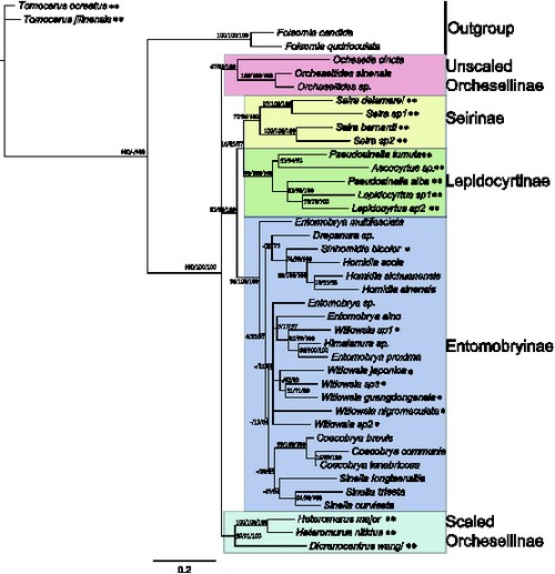 Figure 2. Bayesian phylogeny of Entomobryidae. Species with both terga and dental scales are marked with two asterisks. Scaled species without dental scales are marked with an asterisk.