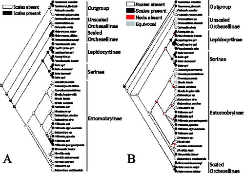 Figure 3. Ancestral character state reconstructions of body scales in Entomobryidae. A, ACSR on a ML-tree with proportional likelihoods shown on each node; B, ACSR summarized on a Bayesian consensus tree over 15,000 sampled trees. Each node indicates character states with different colorations and the proportion of the state over all examined trees.