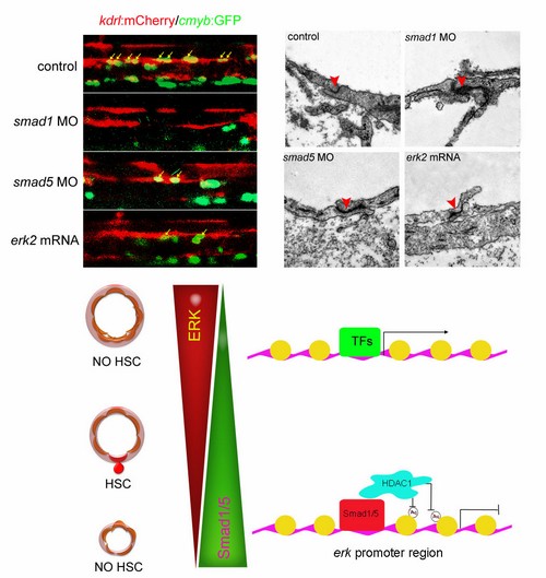 The Hematopoiesis and Cardiovascular Development Group led by Prof. Feng Liu, utilizing two model systems, zebrafish and mouse, identifies a novel regulatory mechanism between BMP and ERK signaling pathways during hematopoiesis. In zebrafish, inhibition of BMP signals or knockdown of its downstream factors smad1 leads to the increase of ERK1/2 expression, which indicates that BMP-Smad1/5 negatively regulates ERK1/2 at transcriptional level. ChIP assay shows that Smad1/5 recruits HDAC1 to the erk1/2 promoter region and leads to the decrease of acetylation level, and finally inhibits ERK1/2 expression. Further studies show that the over-activated ERK1/2 signals caused by the knockdown ofsmad1 or smad5 inhibit HSC emergence through promoting the arterial endothelial cell identity and enhancing the tight junction between endothelial cells. These results are confirmed in the mouse model, and reveal that the cross-talk between BMP and ERK pathways maintains a favorable condition required for the HSC emergence in vertebrates. This work provides new insights into the in vitro generation of transplantable HSCs for potential clinical applications. or smad5