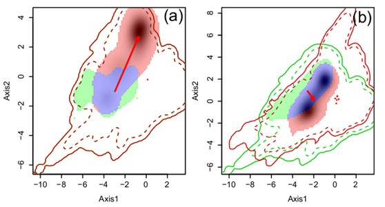 Fig. 1. Examples of climatic niche dynamics between native and invaded ranges: (a) the American bullfrog (Lithobates catesbeianus) introduced within the native biogeographic realm (Nearctic) and (b) the red-eared slider (Trachemys scripta elegans) introduced from the Nearctic to the Palearctic. The solid and dashed contour lines indicate 100% and 75%, respectively, of the available (background) environment (green: the native climatic background; red: the invasive background). Green area: unfilling; blue area: stability; and red area: expansion. The solid arrows (dashed arrows) represent the change in the center of the species niche (climatic space) between the native and invaded ranges (the dashed line in figure (a) is superimposed, as the introduction event occurred in the same biogeographic realm)