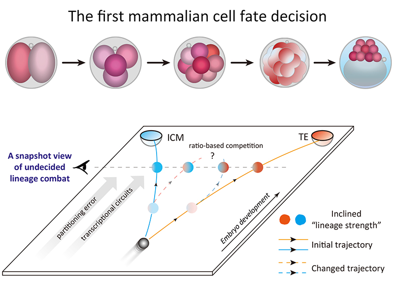 Moreover, the research team further bring up a scenario that opposing lineage specifiers within an early blastomere constantly compete with each other based on their relative ratio, forming an inclined “lineage strength” that push the blastomere onto predisposed, yet flexible lineage track before morphological distinction. Which revealed mammalian early embryo symmetry-breaking as a continuous process rather than a sudden emergence, with the driving force involves both chance separation and defined transcriptional circuits.