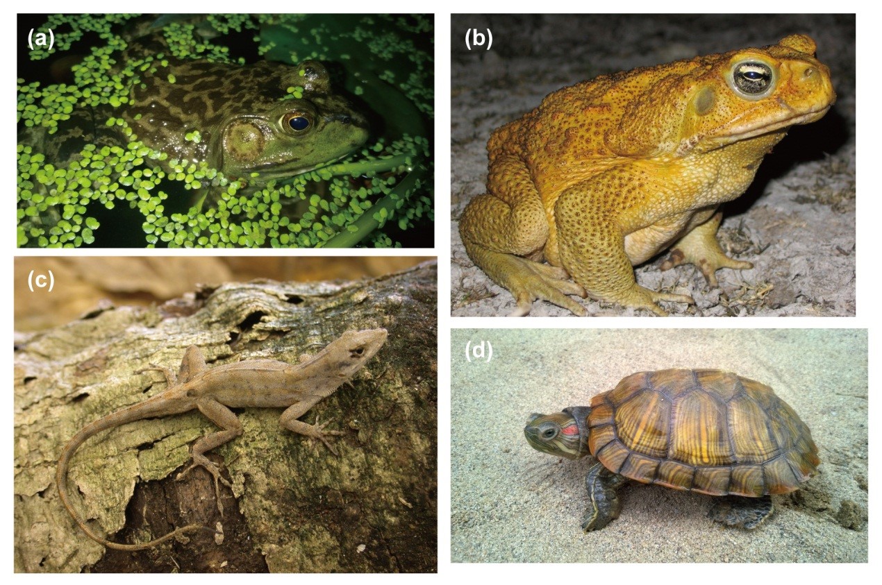 Fig. 1. Four species of invasive herpetofauna. (a) American bullfrog (Lithobates catesbeianus) is responsible for spreading the chytrid fungus that has caused amphibian population declines and is a predator and competitor of many small vertebrates; (b) Cane toad (Rhinella marina) has poisoned native predators in Australia; (c) Brown anole (Anolis sagrei) outcompetes and consumes native lizards; and (d) Red-eared sliders (Trachemys scripta) hybridize with and compete with native turtles.