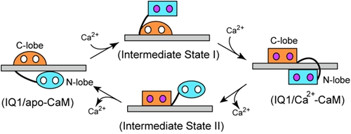 Figure 3. Model for the Ca2+-induced conformational changes of CaM in complex with the Myo5a IQ1.