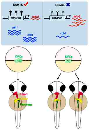 Establishment of the three body axes (anterior-posterior, dorsal-ventral and left-right axes) is a critical step during animal development. Vertebrate body display external symmetry but the internal organs are positioned asymmetrically such as the heart, pancreas, liver and intestines having a defined position within the body cavity. Left-Right asymmetry is first established by breaking symmetry, and then followed by laterality organ formation, where cilia generate directional fluid flow, which leads to asymmetric gene expression. This asymmetric expression pattern then will direct internal organ primordium to position asymmetrically. However, very little is known about the role of DNA methylation in LR determination.