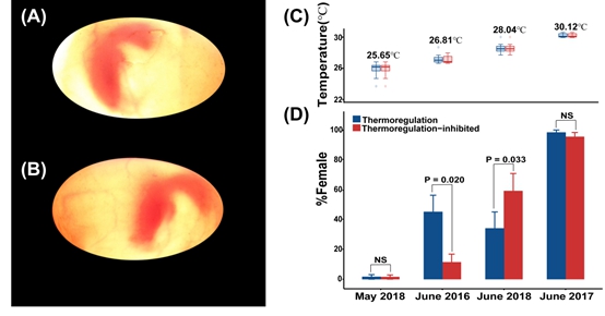 Embryonic thermoregulatory behaviour affects offspring sex ratios in a Freshwater Turtle (Mauremys reevesii): embryos with behavioural thermoregulation select the "Goldilocks Zone” and produce offspring with nearly 1:1 sex ratio.