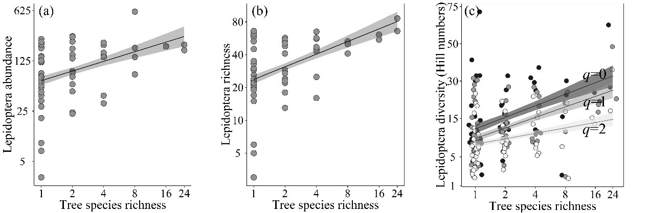Fig. 1. Relationships between tree species richness and (a) abundance of lepidopteran larvae, (b) species richness of lepidopteran larvae, and (c) esitimation of species diversity (q = 0: estimated species richness; q = 1: Shannon diversity; q = 2: Simpson diversity).