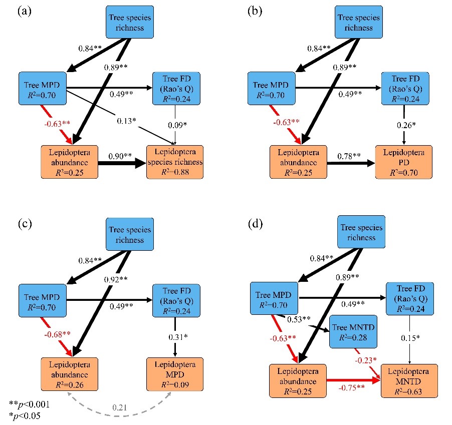 Fig. 3. Path model of trees effects of species richness, phylogenetic diversity (MPD) and functional diversity (FD) (blue color) on abundance of lepidopteran larvae and (a) species richness, and (b) Faith’s phylogenetic diversity (PD), and (c) phylogenetic mean pairwise distance (MPD), and (d) mean nearest taxon distance (MNTD) of lepidopteran larvae (orange color).