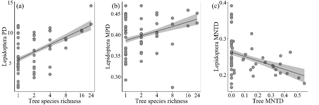 Fig. 2. Relationships between tree species richness and (a) Faith’s phylogenetic diversity (PD) and (b) phylogenetic mean pairwise distance (MPD) of lepidopteran larvae. (c) Relationship between phylogenetic mean nearest taxon distance (MNTD) of trees and lepidopteran larvae