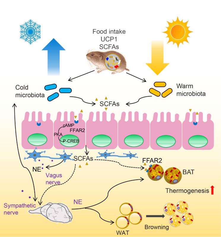 Surviving in the harsh winter is an extreme challenge to the non-hibernating small mammals living in northern temperate area. Mammals, as homoeothermic animals, will cost much to maintain relatively stable and high body temperature (around 37oC). Non-shivering thermogenesis generated in brown adipose tissue (BAT) and controlled by sympathetic nervous system, is a rapid and efficient thermogenesis and plays a critical role in body temperature regulation in small mammals (including hibernating mammals). When animals were exposed to cold, the secretion of norepinephrine (NE) from sympathetic fibers distributing in BAT, is increased to activate the intracellular cAMP-PKA-pCREB signaling pathway. This leads to further increased expression of uncoupling protein 1 (UCP1), a unique thermogenic protein localized in the mitochondrial inner membrane of BAT, and increased capacity of NST. Are the commensal bacterial communities involved in thermoregulation of animal hosts?