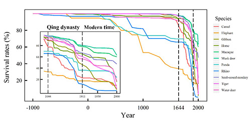 Their results showed that the population of large-sized mammals declined larger and earlier than small-sized mammals over the past two millennia, and all mammals showed precipitous population declines since the Qing Dynasty. Large-sized mammals, such as elephants, rhinos and panda, showed earlier and larger population declines than small-sized ones.