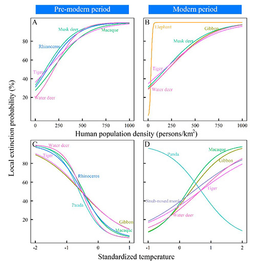They found that the increased local extinction of mammals was associated with intensified human disturbance (particularly for large-sized mammals) and with extreme temperature change (both cooling and warming). In the cold phase (the pre-modern period of China), climate cooling was positively associated with increased local extinction, while in the warm phase (the modern period), global warming was associated with increased local extinction. The interactive effects of climate change and human disturbance was also found for some species, suggesting that habitat fragmentation caused by human activities might accelerate local extinction of mammals by preventing their movement along latitude or altitude under the pressure of climate cooling or warming.