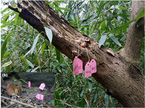 Figure 1 (a) Tagged acorns of oak (Quercus variabilis) were hoarded in the trees by animals; (b) The colored marked chestnut rat (Niviventer fulvescens) was hoarding tagged acorns of oak (Quercus variabilis).