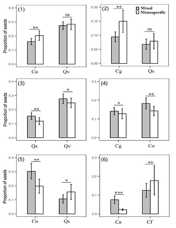 Figure 2 Proportions of scatter‐hoarding of seeds by sympatric rodent dispersers in monospecific and mixed stations. Qv, Quercus variabilis; Ca, Choerospondias axillaris; Co, Camellia oleifera; Qs, Quercus serrata; Cg, Cyclobalanopsis glauca; and Cf, Castanopsis fargesii. Neighbourhood treatments: monospecific, monospecific stations; mixed, mixed stations.