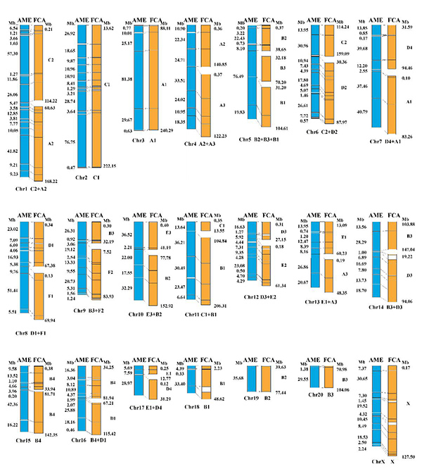 Fig.1 The synteny alignment of giant panda (AME) and cat (FCA) chromosome-level genomes