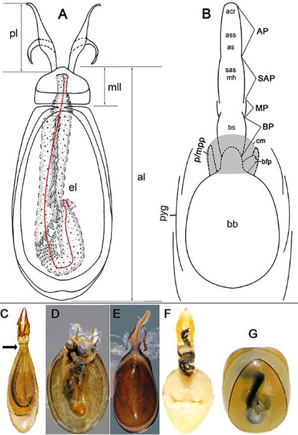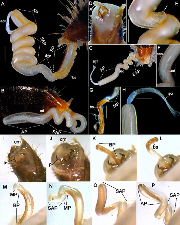 Figure 2. Endophallus Type I of Thyreocephalus hongkongensis (Redtenbacher, 1867). A) Fully everted (BP, MP, SAP, AP), ventrolateral view. B–C) SAP, AP of partly everted endophallus, dorsolateral view. D) Dilated cm. E) Junction point of acr (white arrow). F) sas and ejaculatory duct (ed). G) Dissected bs and MP. H) acr. I–J) cm and p everted. K–L) Phase one: BP everted. M) Phase two: MP everted. N–O) Phase three: SAP everted. P) Phase four: AP everted. acr: apical connective ribbon; bs: basal spines; cm: connective membrane; p: parameres; sas: sub-apical spines. Scale bars 0.30 mm.