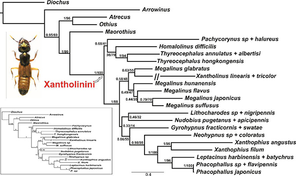 Figure 3. Bayesian phylogenetic tree of Xantholinini, based on the combined dataset including three genes: COI, 28S, wingless, and 26 morphological characters. Posterior probability and Bootstrap values are shown for each clade. Consistent phylogenetic tree obtained with BI and ML with molecular data only shown in blue rectangle.