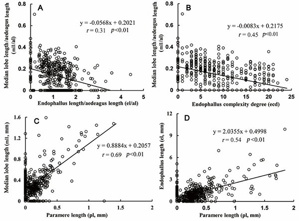 Figure 4. Correlations between median lobe, paramere and endophallus. A) Median lobe length / aedeagus length (mll/al) vs. endophallus length / aedeagus length (el/al). B) Median lobe length / aedeagus length (mll/al) vs. endophallus complexity degree (ecd). C) Median lobe length (mll) vs. paramere length (pl). D) Endophallus length (el) vs. paramere length (pl). pl: paramere length; mll: median lobe length; al: aedeagus length; el: endophallus length. Line represents conventional linear regression.