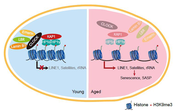 CLOCK is a component of the core molecular circadian clock, which plays important roles in maintaining circadian rhythm at the molecular/tissue/organismal levels. However, the role of CLOCK in regulating human aging remains largely unknown. In this study, researchers generated CLOCK-deficient human mesenchymal stem cells (hMSCs) by CRISPR/Cas9-mediated gene editing and directed differentiation and found that CLOCK deficiency accelerated hMSC senescence. Mechanically studies further revealed that CLOCK formed a complex with nuclear lamina proteins lamin B1, LBR, and Emerin as well as a heterochromatin-associated protein KAP1 to stabilize heterochromatin and inhibit excessive transcription of repetitive elements, thus contributing to genomic stability and stem cell rejuvenation independent of its transcriptional activation activity. Accordingly, re-introduction of wildtype CLOCK or its transcriptional inactivation mutants effectively delayed the senescence phenotypes of hMSCs. Furthermore, CLOCK was downregulated in replicative-senescent, physiological-senescent and premature aging human mesemchymal stem cells whereas the overexpression of CLOCK effectively reversed the senescence phenotypes of these hMSCs. More importantly, overexpression of CLOCK mitigated the degeneration of articular cartilage, reduced the proportion of senescent cells, increased the level of H3K9me3, suppressed immune response and stimulated cartilage regeneration, thereby alleviating age-related joint degeneration and improving athletic ability in aged mice.