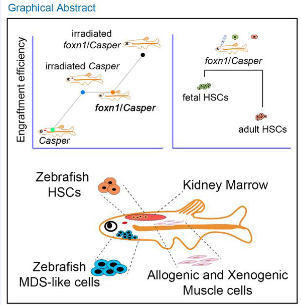 Then, they found that fetal HSCs exhibit higher engraftment efficiency than adult HSCs, RNA-seq data revealed that fetal HSCs harbor stronger cell-cycle activity than adult HSCs. By successful engraftment of allogeneic zebrafish or xenogenic medaka muscle cells in foxn1/Casper mutant, they proposed that foxn1/Casper mutant can serve as a great model for direct visualization of transplanted cells in vivo and xenografting in future studies. They also validated that foxn1/Casper mutant could engraft allogeneic MDS-like cells. Transplantation with foxn1/Casper mutant could achieve direct observation of the transplanted MDS-like and muscle cells in living recipients, which provides a potential platform to study therapeutic strategies for blood disease and solid tumors.