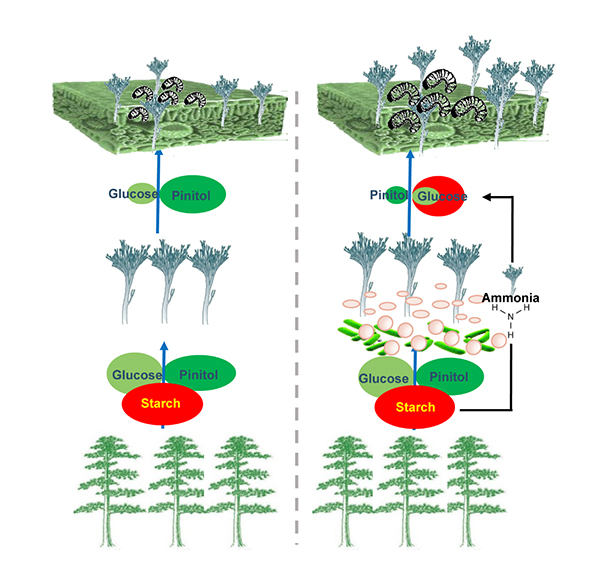 Laboratory experiments show that when the beetle’s bacterial associates are absent (see left side of figure), the fungi preferentially consume the highly nutritional D-glucose, leaving behind pinitol, an inferior carbon source, resulting in poor beetle larvae growth and high mortality. However, in the presence of the beetles’ bacterial associates (simulated by presence of ammonia, see right side of figure), the fungus’ carbohydrate consumption is accelerated, consuming both pinitol and D-glucose converted from starch by the associated fungus,which reduced the competition for carbon source between the beetle and fungus.