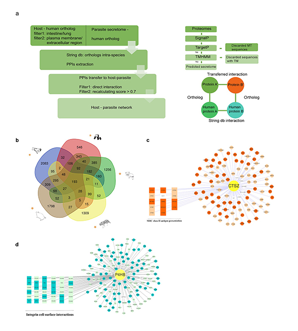 Figure 1. Analyses of genome-level protein interactions between five non-model mammals and their parasitic roundworms revealed that the immunoregulatory proteins CTSZ and P4HB played a central role in the protein interaction network.