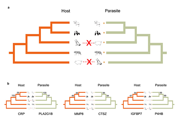 Figure 2. Phylogenetic relationships between mammalian hosts and their parasitic roundworms at the species-level (a) and gene-level (b), reflecting the gene-level coevolution between hosts and roundworms.