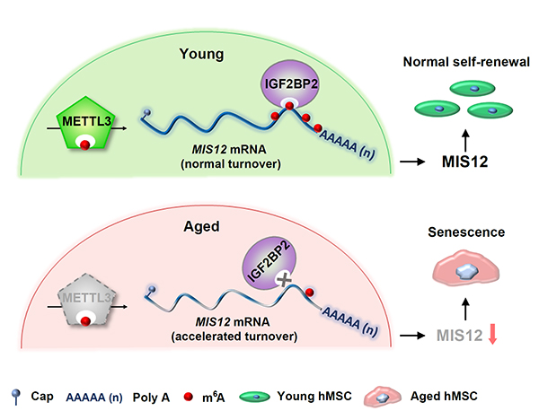 In the study, researchers first found that the levels of both m6A RNA methylations and its METTL3 were reduced during human stem cell aging. Knockout of METTL3 accelerated stem cell senescence whereas overexpression of METTL3 rescued cellular senescence phenotypes. Transcriptional profiling of m6A modifications further identified MIS12, a cell cycle regulator, of which m6A modifications were reduced in both hMSCs and METTL3-deficient hMSCs. Mechanistically, loss of m6A modifications decreased the expression and accelerated the turnover of MIS12 mRNA while knockout of MIS12 accelerated cellular senescence. Furthermore, m6A reader IGF2BP2 was identified as a key player in recognizing and stabilizing m6A-modified MIS12 mRNA; knockdown of IGF2BP2 also accelerated senescence in human stem cells.