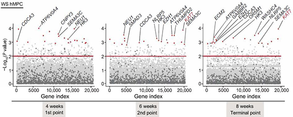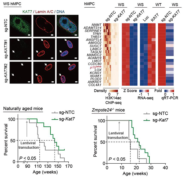In this study, the researchers conducted genome-wide CRISPR/Cas9-based screens in human premature aging stem cells and identified more than 100 candidate senescence-promoting genes (Figure 1). The researchers further verified the effectiveness of inactivating each of the top 50 candidate genes in promoting cellular rejuvenation using targeted sgRNAs. Among them, KAT7 encoding a histone acetyltransferase, was identified as one of the top targets in alleviating cellular senescence. KAT7 increased in human mesenchymal precursor cells during physiological and pathological aging. KAT7 depletion attenuated cellular senescence whereas KAT7 overexpression accelerated cellular senescence. Mechanistically, inactivation of KAT7 decreased histone H3 lysine 14 acetylation, repressed p15INK4b transcription, and rejuvenated senescent human stem cells (Figure 2).
