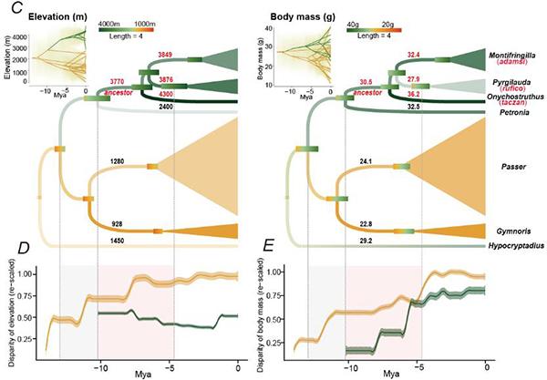 Figure 1. Reconstruction of ancestral traits (elevation and body mass) for species of the family Passeridae. Green curve lines indicate snowfinches. (Image by IOZ).