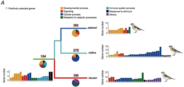 Researchers then carried out comparative genomics and functional experiments using representatives of the three major clades of snowfinches. They demonstrated that the genetic background of the common ancestor only partly constrained the adaptive diversification of the three snowfinch species. That is, by searching the signals of positive selection, they found that only a dozen positively selected genes in the ancestor branch continued to be subjected to positive selection in the three descendants, but two of the three species (adamsi and rufico) are significantly similar to their ancestor in terms of biological functions of the positively selected genes (Figure 2).