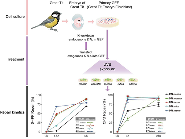 Figure 3. A schematic representation of the functional experiment with DTL. The repair kinetics of DNA damage varies across the ancestral and descendant snowfinches. (Image by IOZ)