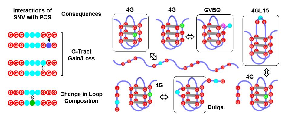 Illustration. Potential G-quadruplex structure changes that can be induced by an SNV.