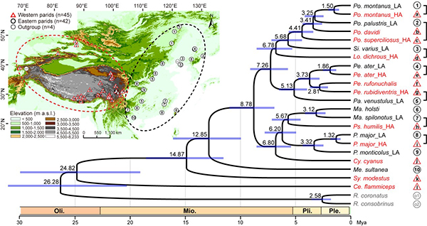 To test the above hypothesis, they compared genomes of closely related, co-distributed tit species across East Asian continent. As East Asia is a region of extreme environmental variation. The eastern region of East Asia is at or near sea level, but western East Asia is dominated by the Qinghai–Tibet Plateau, with an average elevation of 4500 m a.s.l. During the Pleistocene, the western region was covered by glaciers, whereas the eastern lowlands were largely ice free. The tits and chickadees (Passeriformes: Paridae) that originated from the Sino-Himalayan region have 19 species distributing in both the eastern lowlands and western highlands throughout East Asia. Tits living in western highlands include western endemics and western populations of the widespread species (Fig. 1). Such species complexes consisting of species with variable demographic histories inhabiting extreme environments provide an opportunity to test this hypothesis.