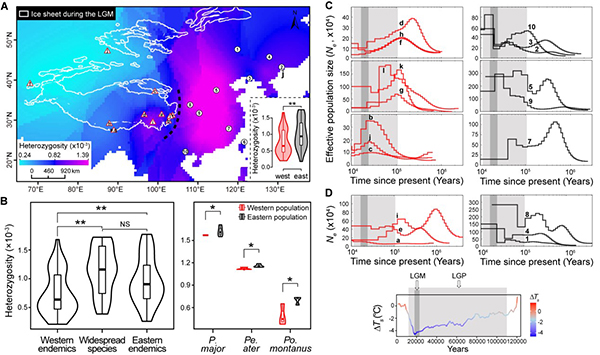 Fig. 2. (A) Spatial distribution of the heterozygosity. (B) Comparisons of heterozygosity levels among taxa. (C) Historical demography of western and eastern endemic tits. (D) Demography of widespread species.