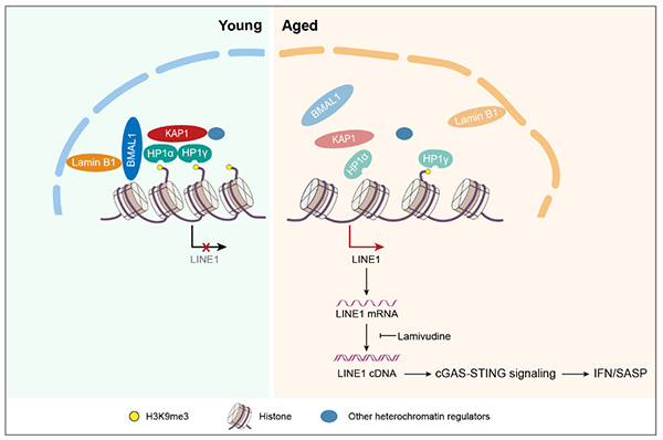 Figure: Dampened BMAL1 occupancy on LINE1 elements leads to its derepression and thus activates cellular senescence through cGAS-STING pathway.