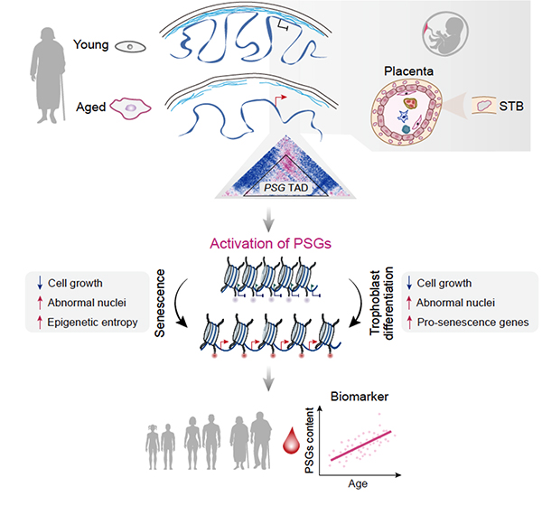 In a new study published on Developmental Cell, researchers from the Institute of Zoology and the Beijing Institute of Genomics of the Chinese Academy of Sciences have collaborated to decode the large-scale remodeling of the epigenomic landscape during aging. They found that aberrant expression of placenta-related genes is the key driver and molecular biomarker of cellular aging.