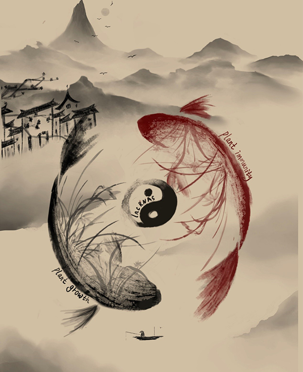 The balance of immunity and growth would finally decide the crop yield. Liu et al., report the fine-turning mechanism of lncRNA on plant immunity and growth balance. The Yin-Yang fish has been widely used to represent the balance of two different properties or the transformation between them. The black fish represents the growth of plants and the red fish represents the immunity responses of plants.