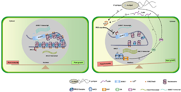 The researchers identified a lncRNA termed salicylic acid biogenesis controller 1 (SABC1), that decreases upon infection of bacteria pathogen, Pseudomonas syringae strain DC3000-avrRpt2. They further clarified the regulatory role of SABC1 as a lncRNA in suppressing plant immunity and promoting plant growth through inhibiting its neighboring gene NAC3.NAC3 act as a transcription factor to activate transcription of isochorismate synthase 1 (ICS1), a key enzyme catalyzing salicylic acid (SA) biosynthesis. SABC1 inhibits the transcription of NAC3 by recruiting the polycomb repressive complex 2 to mediate the H3K27me3 of NAC3, which would finally repress SA production, so as to restrict immunity response and make way for plant growth. Upon bacteria and virus infection, SABC1 is downregulated to activate NAC3 transcription to trigger SA production and derepress the resistance to bacteria and viruses.