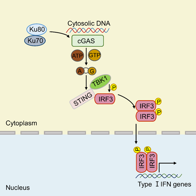 In this study, the researchers identified Ku proteins as positive modulators of the cGAS-mediated signaling pathway. Researchers demonstrated that Ku proteins directly interacted with cGAS, promoted the DNA binding affinity of cGAS, augmented its condensation, and enhanced its enzyme activity to produce more cGAMP, thereby facilitating the activation of cGAS-STING signaling pathway. This work provides insights into understanding the effective regulatory mechanism of cGAS-mediated innate immune signaling.