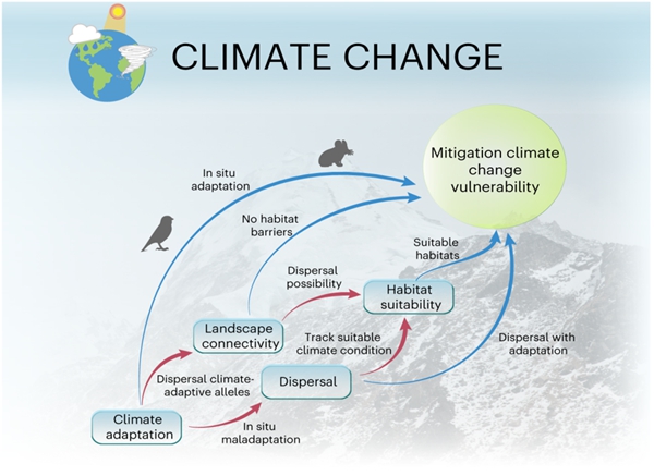 Figure 2. Climate adaptation, dispersal with adaptation, habitat suitability and landscape connectivity may act alone (blue arrows) or interact with other processes (red arrows) to mitigate risks caused by the climate change.